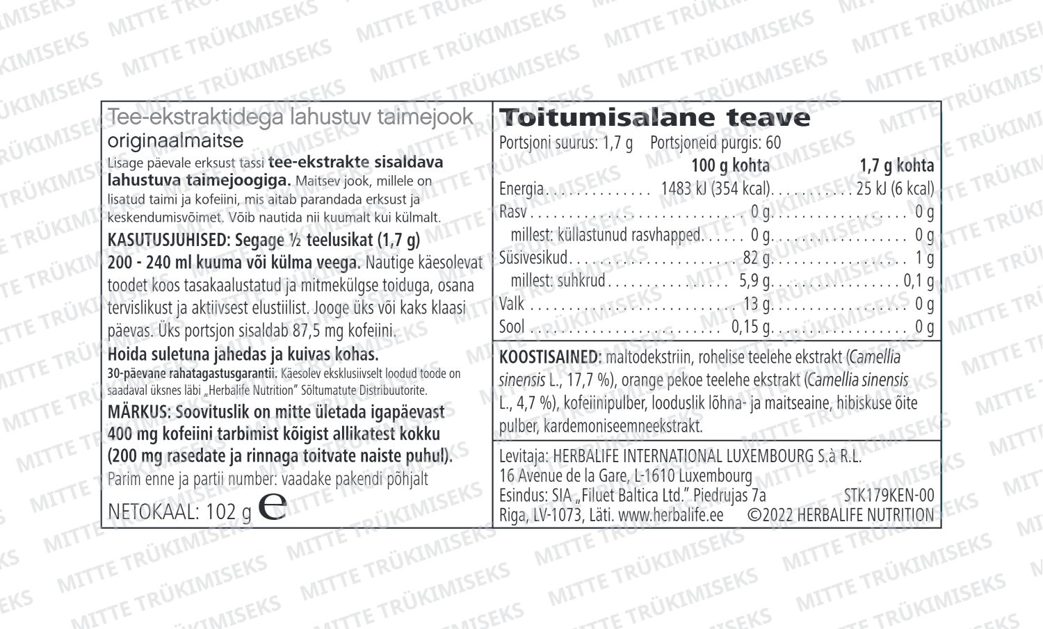 Segage ½ teelusikat (1,7 g) 200-240 ml kuuma või külma veega. Nautige seda toodet tasakaalustatud ja mitmekesise toitumise raames osana tervislikust ja aktiivsest elustiilist. Jooge üks või kaks klaasi päevas. *Soovitatav on mitte ületada kõigist allikatest saadud kofeiini ööpäevast kogust 400 mg (200 mg rasedateja imetavate naiste puhul). Ühekordset kofeiini kogust 200 mg ei tohi ületada